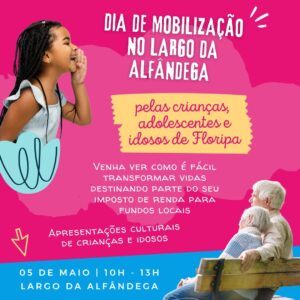 Para ensinar e tirar todas as dúvidas de como fazer a destinação de parte do seu IR ao Fundo da Infância e Adolescência (FIA) e ao Fundo do Idoso (FI), a FloripAmanhã, juntamente com a Prefeitura de Florianópolis, entidades empresariais, sociais e de contabilidade, vão promover no dia 5 de maio, das 10h às 13h, um dia de Mobilização no Largo da Alfândega pelas crianças, adolescentes e idosos de Florianópolis.