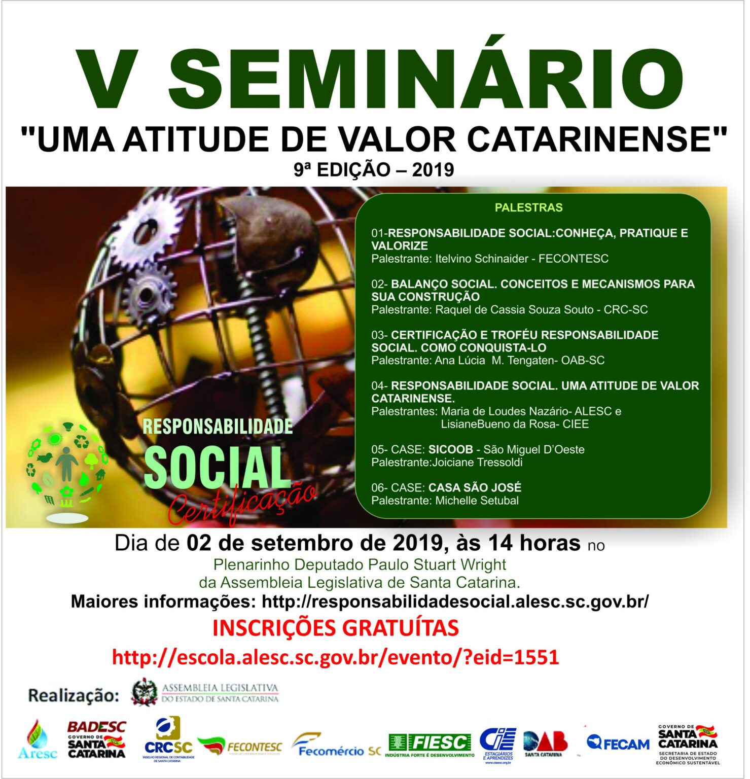 O seminário “Uma Atitude de Valor Catarinense”, tem confirmados as palestras: Responsabilide Social: Conheça, Pratique e Valorize, que será ministrada por Itelvino Schinaider, representante da Fecontesc; Balanço Social, Conceitos e Mecanismos Para sua Construção, que terá como palestrante a representante do Conselho Regional de Contabilidade (CRC), Raquel de Cassia Souza Souto; Certificação e Troféu Responsabilidade Social, Como Conquistá-lo, por Ana Lúcia Tengaten, da OAB.