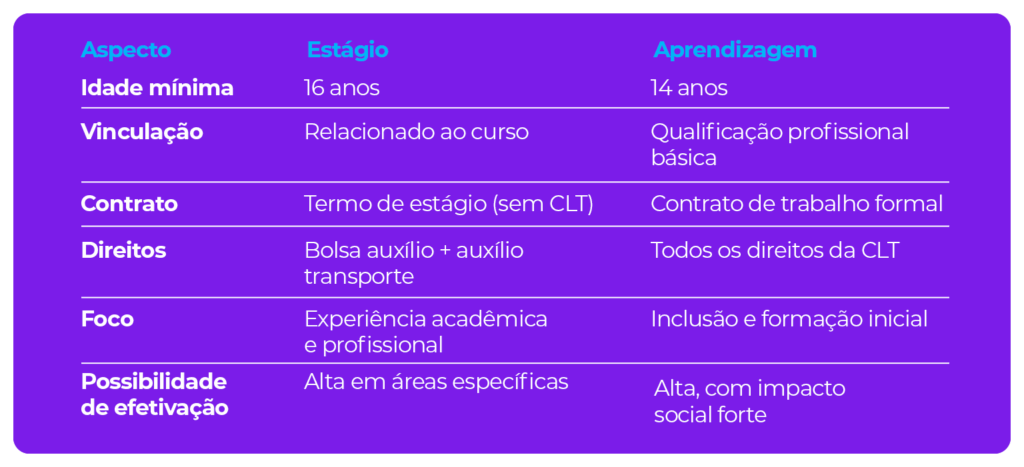 - O estágio é mais flexível, enquanto a aprendizagem traz mais segurança contratual.