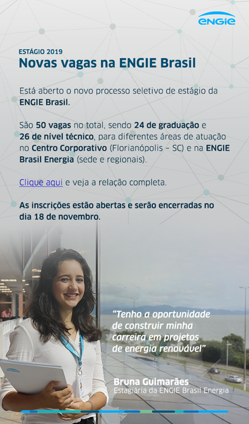 Engie, a maior produtora independente de energia no mundo, busca estudantes para: PROGRAMA DE ESTÁGIO – ENGIE BRASIL.