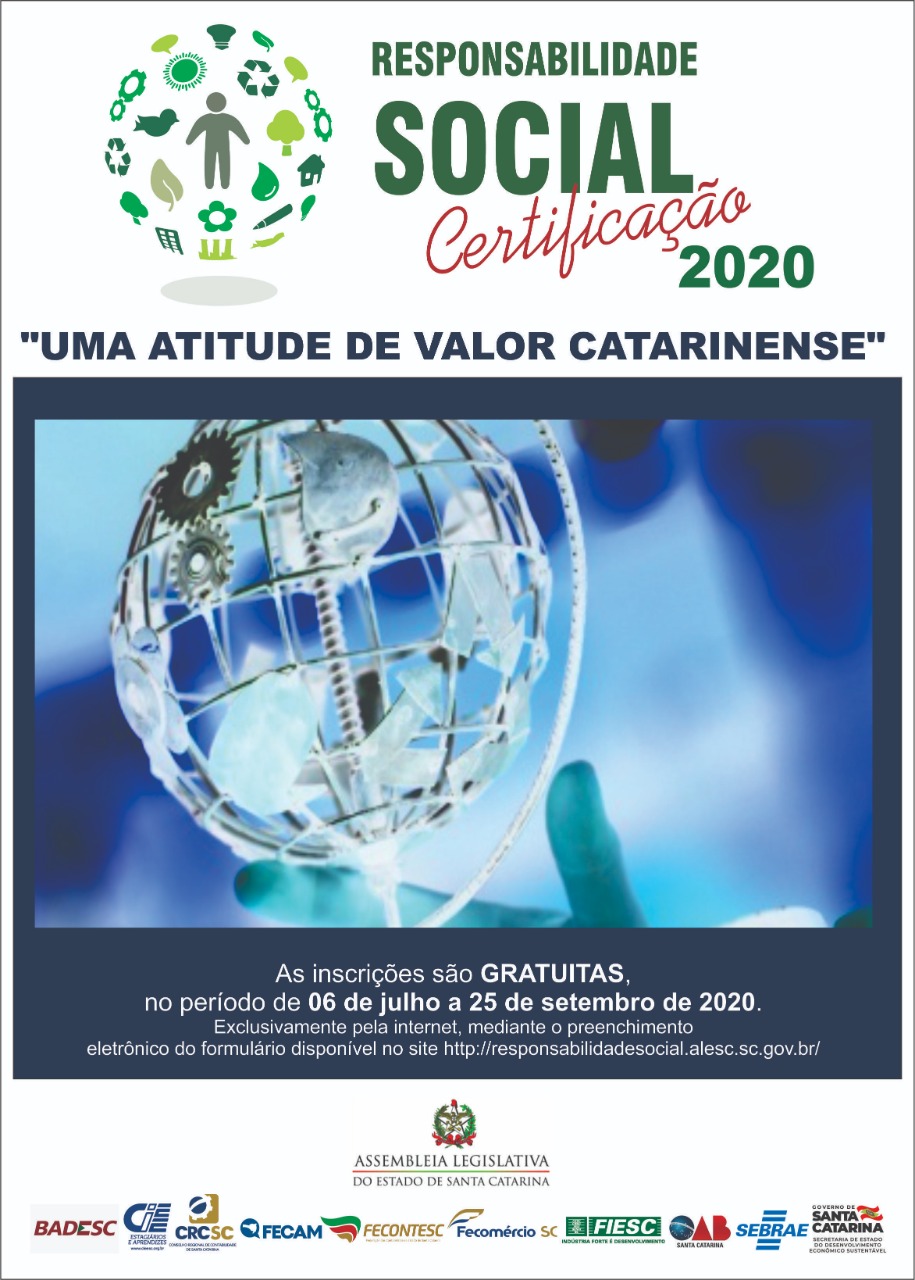 No dia 06 de julho de 2020 será publicado o Edital da 10ª Edição da Certificação de Responsabilidade Social com a abertura das inscrições on-line para as empresas privadas, empresas públicas, sociedades de economia mista e organizações com fins não econômicos, através do site: http://responsabilidadesocial.alesc.sc.gov.br/. As inscrições irão até o dia 25 de setembro.