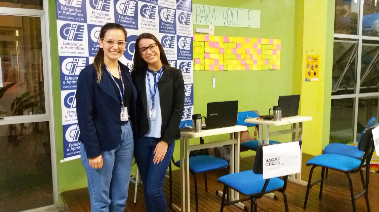 As colaboradoras do CIEE Araranguá, Camila Nunes e Caroline Burigo, estiveram nas universidades UFSC e Unisul realizando cadastros e encaminhamentos para vagas de estágio.