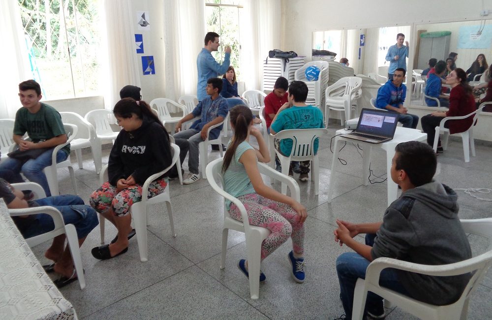 A oficina foi conduzida pelo educador Marcel Meyer e os estagiários de Psicologia, Isabela e João, tendo como objetivo proporcionar reflexões sobre o papel dos jovens no mundo do trabalho, como elaborar um currículo e noções de entrevista de emprego, de forma bastante lúdica e dinâmica.
