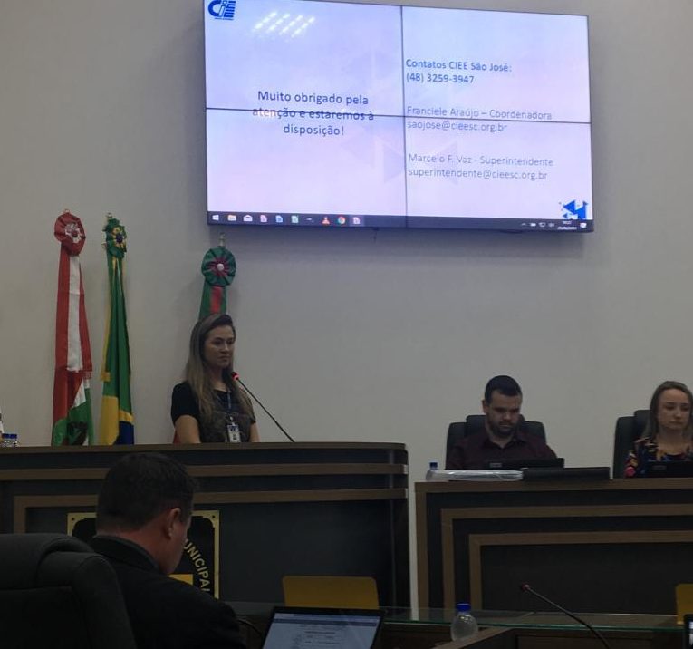 Todos os vereadores estavam presentes e algumas pessoas da comunidade. Após explanação da coordenadora do CIEE São José, Franciele Araujo, o vice-presidente da Câmara, Joel Filipe Gaspar, parabenizou a entidade pelos importantes trabalhos realizados em benefício dos jovens em situação de vulnerabilidade social do município de Palhoça.