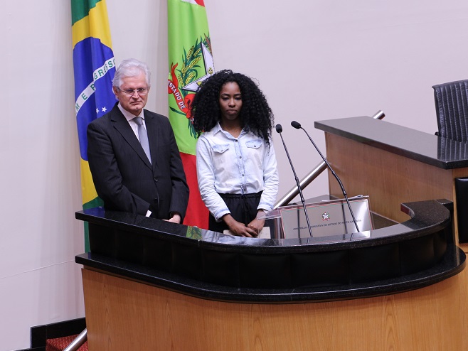 A assistente social Karoline Franciele dos Santos deu um depoimento na tribuna sobre a importância da oportunidade que o CIEE/SC abre aos jovens. Ela conheceu a instituição aos 15 anos, quando participou de um curso do Programa de Iniciação ao trabalho. Após o curso, conseguiu uma oportunidade como aprendiz, foi contratada e ingressou na Universidade Federal de Santa Catarina (UFSC), onde concluiu a graduação em Serviço Social e atualmente faz mestrado.