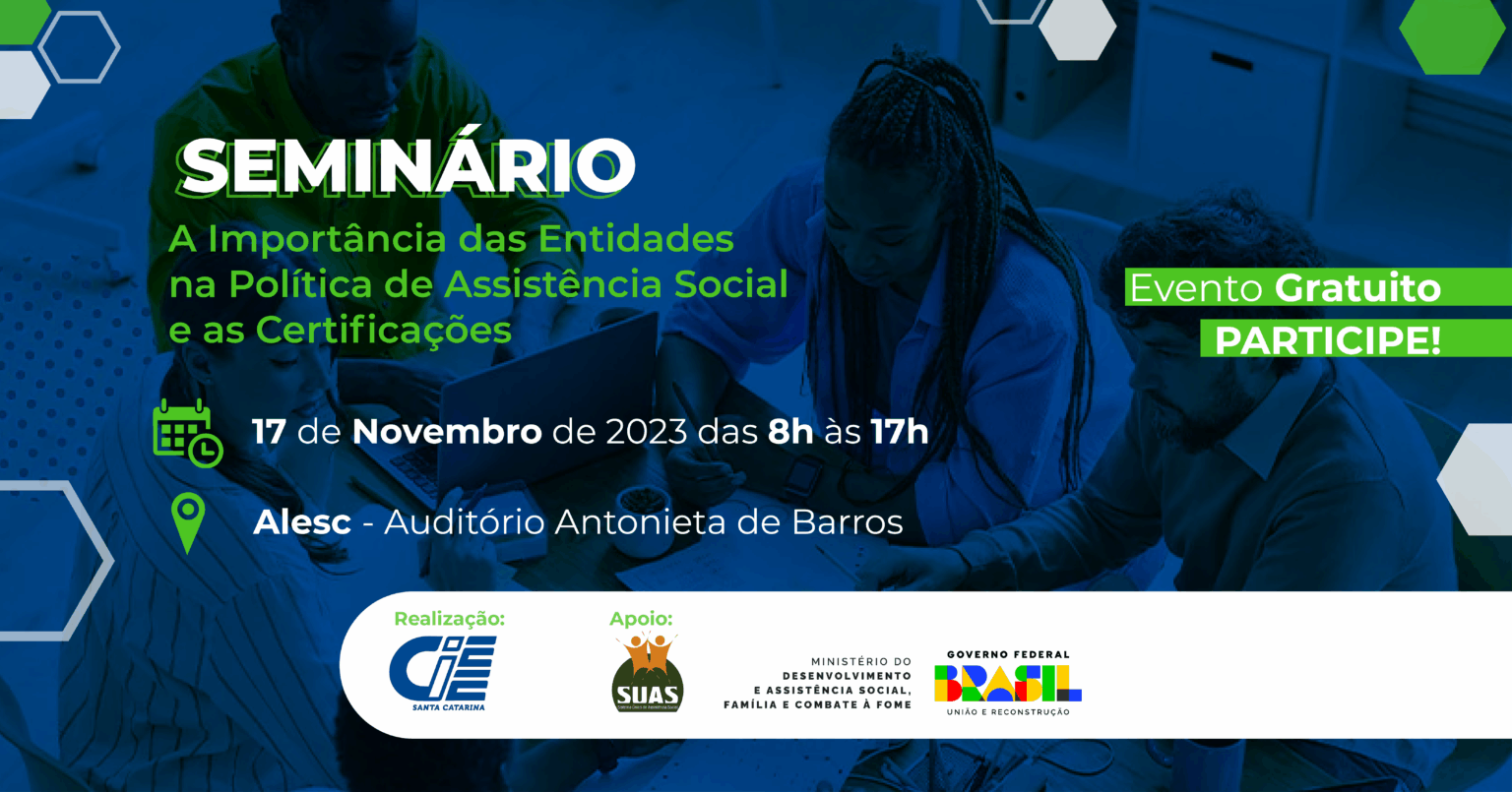 O Centro de Integração Empresa-Escola – CIEE/SC promove no dia 17 de novembro o Seminário “A importância das Entidades na Política de Assistência Social e as Certificações”. O evento será realizado das 8h às 17 horas no auditório Antonieta de Barros da Assembleia Legislativa de Santa Catarina – Alesc.