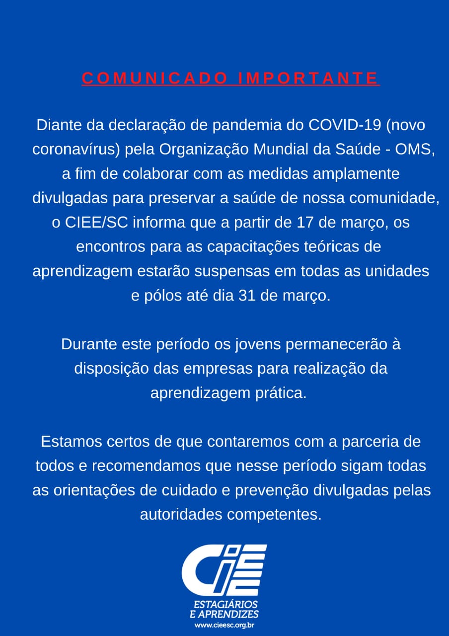 Diante da declaração de pandemia do COVID-19 (CO coronavírus) pela Organização Mundial da Saúde – OMS, a fim de colaborar com as medidas amplamente divulgadas para preservar a saúde de nossa comunidade, o CIEE SC informa que a partir de 17 de março, os encontros de capacitação teórica de nossos aprendizes preventivamente, serão suspensos até 31 de março em todas as nossa unidades e polos de aprendizagem.