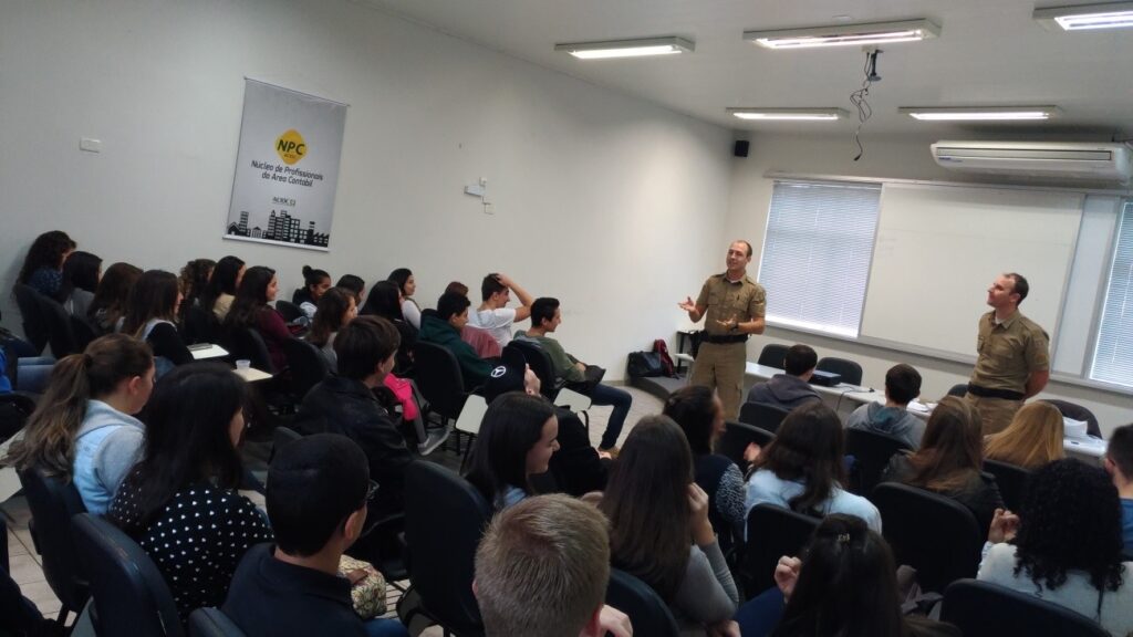 Nesta terça-feira (6), os policiais do Proerd, Jésse e Marcos, ministraram palestra sobre prevenção ao uso de drogas para os