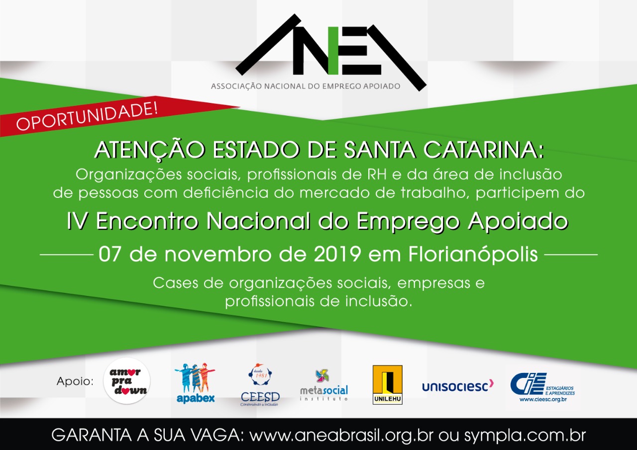A Anea – Associação Nacional do Emprego Apoiado promove o seu IV Encontro Nacional do Emprego Apoiado para discutir temas importantes relacionados aos avanços do uso do método do Emprego Apoiado na inclusão das pessoas com deficiência no mercado de trabalho. Neste ano, o evento será realizado na capital catarinense, para avançarmos com a estratégia de expansão territorial de atuação da Anea que busca a cada ano envolver um maior número de organizações e profissionais dos mais diversos Estados brasileiros.